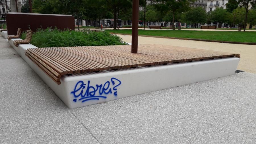 Il est regrettable que vous n’ayez pas répondu, malgré nos deux rappels à le faire. Si nous sommes heureux que les bancs gondoles n’aient pas été supprimés comme cela nous avait été annoncé, nous prenons acte du choix de ne pas peindre pour protéger et faciliter l’entretien. Aussi réitérons-nous notre question : comment comptez-vous nettoyer les tags sur le bois brut ?